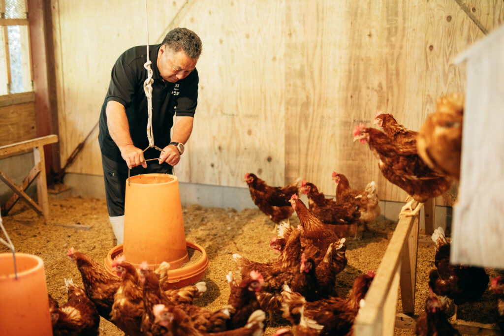 岡野さん:とはいえ、国産マンゴーは非常に高価で、そのままエサにしてしまうと卵1個が1万円ほどになってしまいます。フィリピンでもマンゴーは高級果実ですが、日本ほどではありません。しかし生のままでは輸入ができないため、現地に工場をつくり、飼料に加工してから輸入する仕組みを整えました。 飼料にはマンゴーの果実だけでなく、芽や種まで配合し、さらにココナッツなども加えています。でき上がった飼料は甘い香りが漂い、人間でも食べたくなるような風味です。2010年頃から開発を進め、2016年には特許申請も行い、いよいよ天草で“マンゴーで育った卵”の本格商品化に踏み出しました。それが「天草タマンゴ」です。 平島さん:卵の育つ環境にも徹底してこだわっています。品種は赤玉卵を産むボリスブラウン種を採用。鶏がストレスなく自由に動き回れる「平飼い」で育て、産卵も鶏が好きなタイミングに任せています。抗生剤やホルモン剤は一切使わず、自然に近い形で飼育しています。さらに、通常は3年ほど産卵が続きますが、より風味の良い卵を届けるために、1年半ほどで鶏を入れ替える運用にしています。 こうしたこだわりを積み重ねた結果、卵1個880円(ネット通販価格)という“高級卵”が誕生しました。価格だけを見ると驚かれるかもしれませんが、それに見合う美味しさが口コミやSNSで広がり、メディアにも取り上げていただく機会が増えてきました。 「天草から新名物を」という念願に向かって、ようやく階段を登り始めていると感じています。