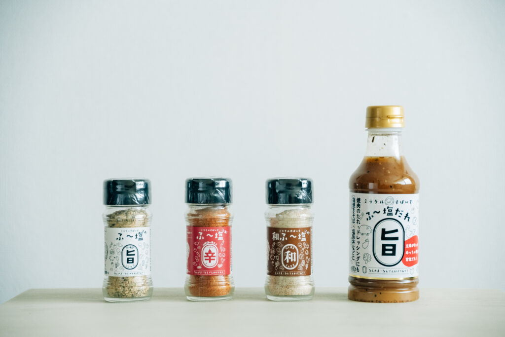 ふ~ちゃん秘蔵のレシピをもとに、まず開発したのがメイン商品「旨ミックス」。家庭的な味わいをそのままに、商品としての扱いやすさや保存性、美味しさを高めるための素材を一つひとつ選びました。 塩はふ~ちゃんが試作を重ね、天日塩と岩塩の絶妙なブレンドに。粉末醤油、カツオ粉末、昆布茶などの旨味素材に、ガーリックや生姜、バジルなど数種のスパイスを合わせることで、深い旨味と香ばしさが広がる味に仕上げました。この絶妙な配合のバランスには特に時間をかけました。 肉、魚、野菜――本当に何にでも合う万能スパイスです。発売当初は近隣の物産館や道の駅で細々と販売していましたが、SNSで“美味しい”と広められたことで需要が拡大。生産量も大きく伸び、現在は「和」「辛」「塩だれ」などバリエーションも充実しています。 主婦の知恵から生まれた調味料が、いま全国へと広がりつつあります。