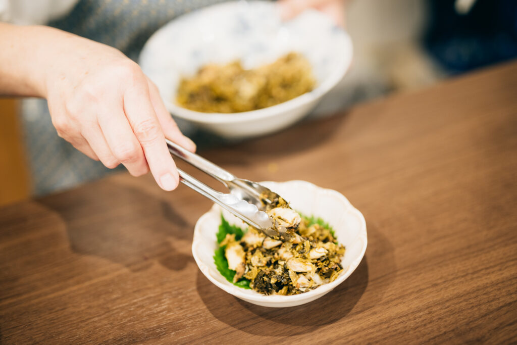 この「鯖たかな」、単に素材を混ぜ合わせるだけではなく、素材選びからバランスまで研究を重ねています。そして、素材そのものの良さを生かし、手作りならではの温かみを感じてもらえるよう、調理の工程一つ一つを丁寧に行っています。 阿蘇高菜は新物ではなく古漬を仕入れて油炒めをすることで、深みのある味わいを引き出します。そしてサバは普通の塩サバではなく、北海道産の利尻昆布につけ込んだものを丁寧に骨抜きして使用。身がほっくりと柔らかく旨味がとても豊かで、高菜のピリリとした辛味との相性が抜群です。味わいにまろやかさと奥行きを出すため、ゴマ油などでひと工夫を施し、サバは細かくほぐし過ぎずゴロッとした身を残すことで、食べたときの満足感を高めています。 熊本では数少ないおばんざいのお店で、偶然の出会いから生まれた家庭の味。手間暇をプラスしたこだわりの美味しさで、素朴な料理をしっかりと格上げしています。